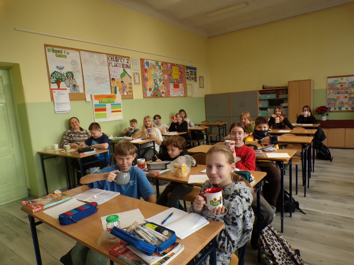 Uczniowie klasy 5a podczas lekcji języka polskiego tworzyli własne instrukcje parzenia herbaty, a następnie sprawdzali je w praktyce. Wkrótce cała sala wypełniła się przyjemnym aromatem naparu, a wspólna praca stała się ciepłym, integrującym doświadczeniem. To była nauka, która naprawdę „smakowała”.