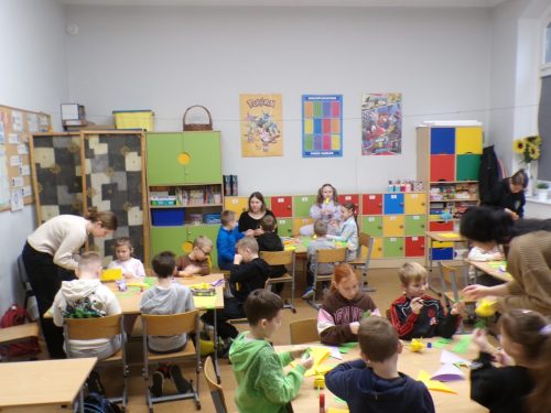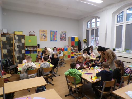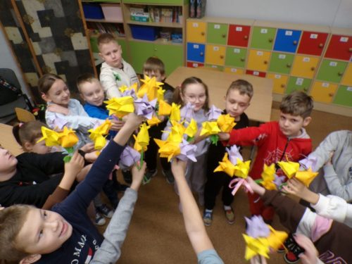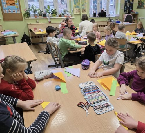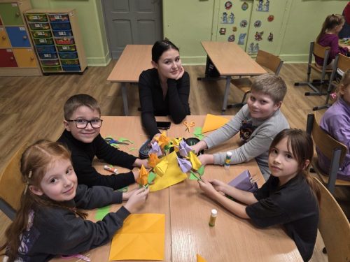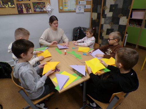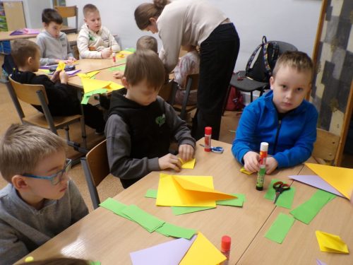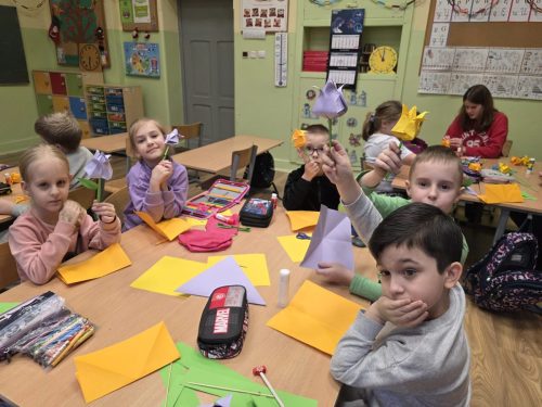 Podczas spotkań uczniowie tworzyli prezenty z okazji zbliżającego się Dnia Babci i Dziadka, wykorzystując technikę origami.