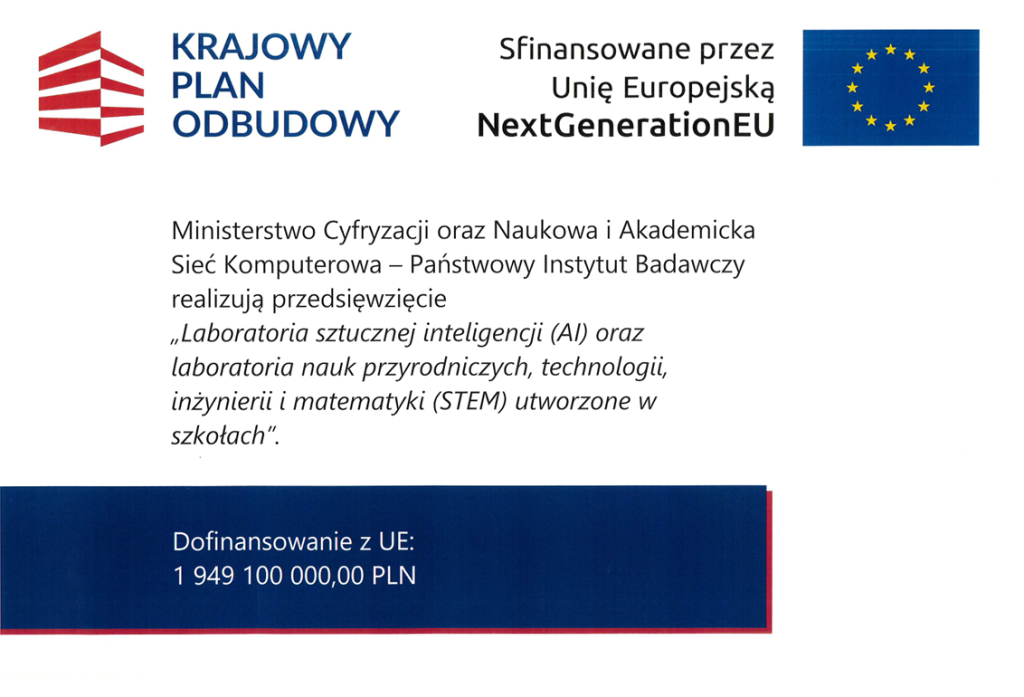 Ministerstwo Cyfryzacji oraz Naukowa i Akademicka Sieć Komputerowa – Państwowy Instytut Badawczy realizuje przedsięwzięcie „Laboratoria sztucznej inteligencji (AI) oraz laboratoria nauk przyrodniczych, technologii, inżynierii i matematyki (STEM) utworzone w szkołach”.