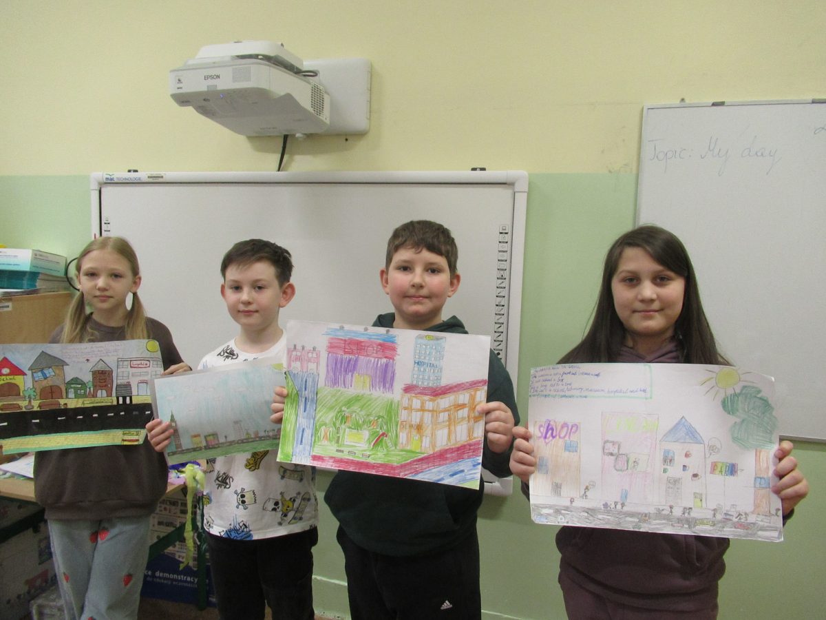 Uczniowie klasy 3b zaprojektowali swoje wymarzone miasta, a następnie przedstawili swoje pomysły w języku angielskim. Nie zabrakło przy tym utrwalania słownictwa związanego z miejscami, które mogą znajdować się w mieście, jak i prawidłowego zastosowania przyimków. Powstały niezwykle ciekawe i twórcze prace, a ich prezentacja rozwinęła umiejętność komunikowania się uczniów w języku obcym.