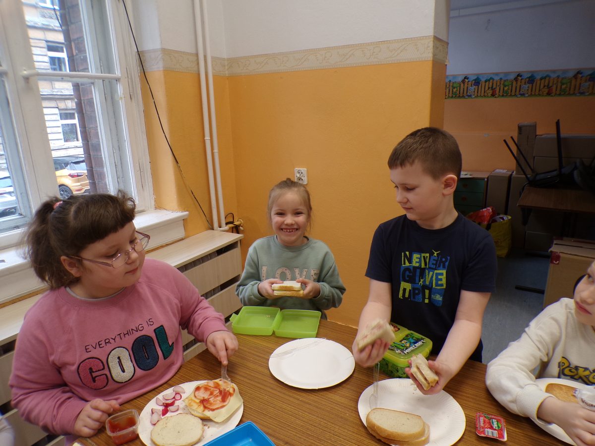 Uczniowie klasy 1b poznają nazwy produktów oraz potraw w języku angielskim. W tym tygodniu w szkolnej kuchni samodzielnie przygotowali drugie śniadanie utrwalając poznane słownictwo. Było pysznie.