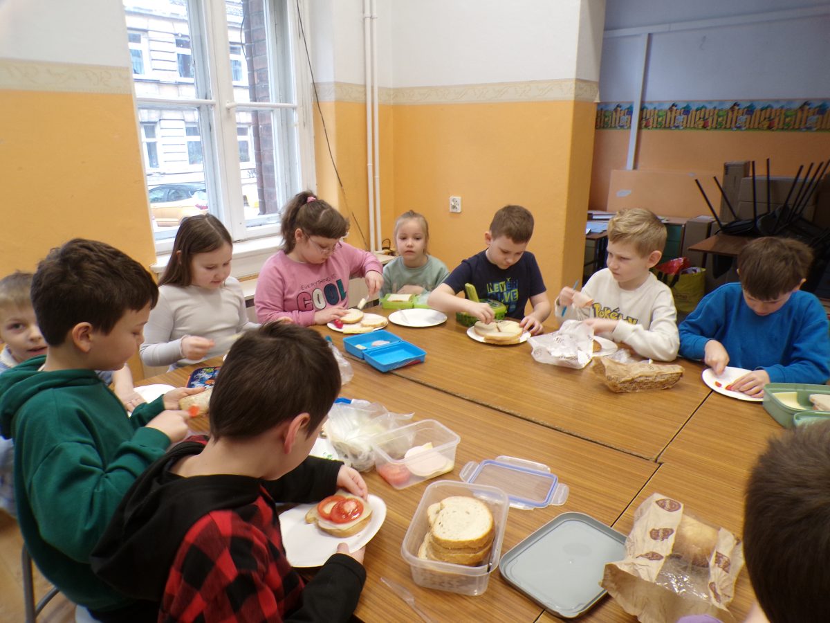 Uczniowie klasy 1b poznają nazwy produktów oraz potraw w języku angielskim. W tym tygodniu w szkolnej kuchni samodzielnie przygotowali drugie śniadanie utrwalając poznane słownictwo. Było pysznie.