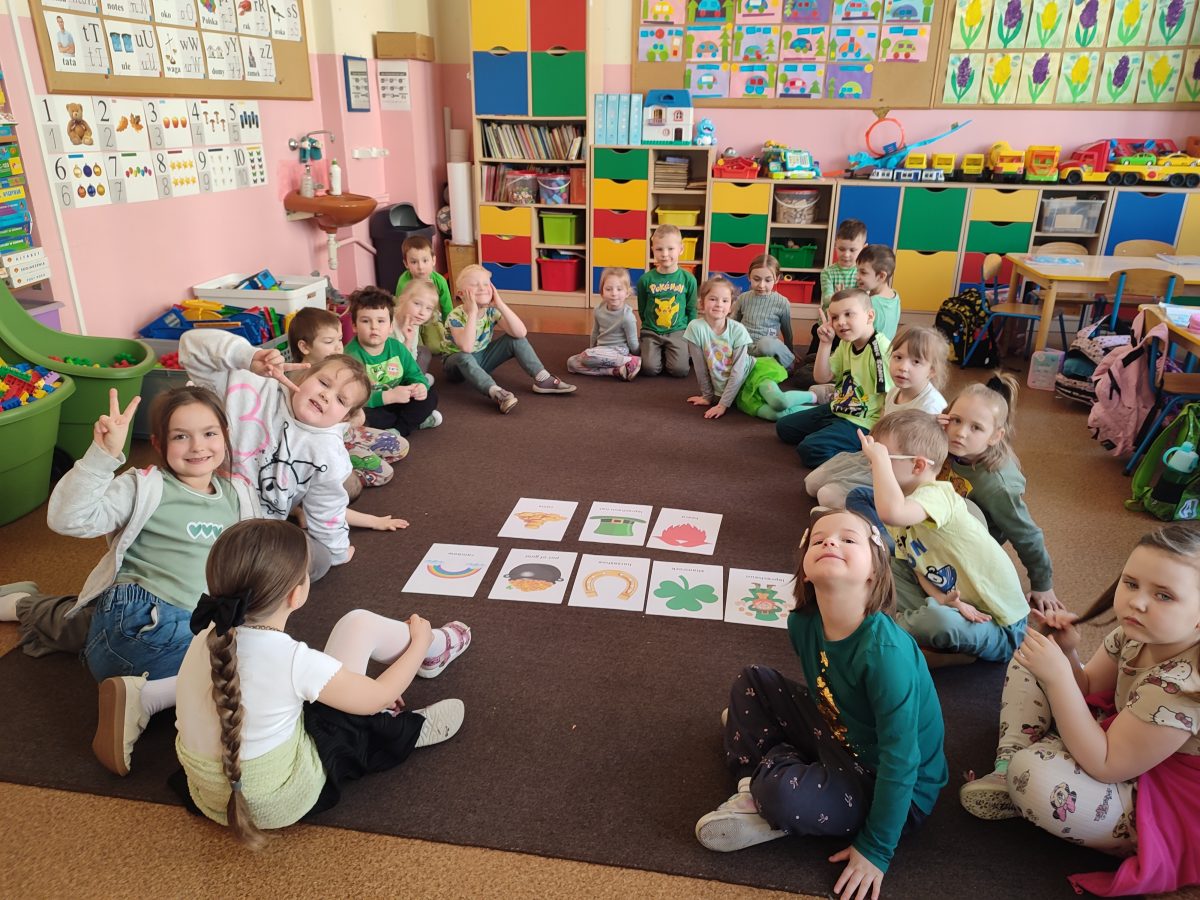 Podczas zajęć z języka angielskiego świętowaliśmy dziś Dzień św. Patryka. Dzieci poznawały proste słówka i zabawy związane z tym irlandzkim świętem, a w salach królował kolor zielony.